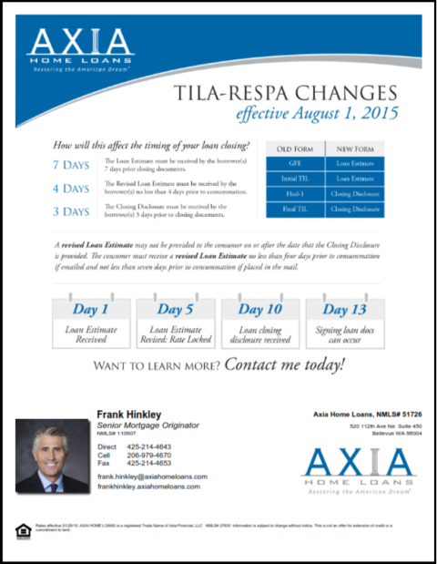 Frank Hinkley will be in to discuss the TILA-RESPA changes coming August 1st. He will discuss how this will affect the timing of your loan closing, so don't miss out!