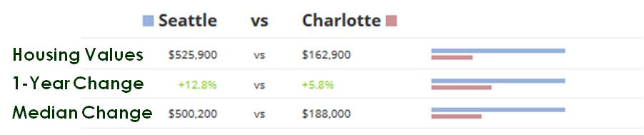 - Seattle, WA tends to be more expensive for home buyers than Charlotte, NC. During the last year, Seattle home values have risen by 12.8%, while Charlotte home values have risen by 5.8%.